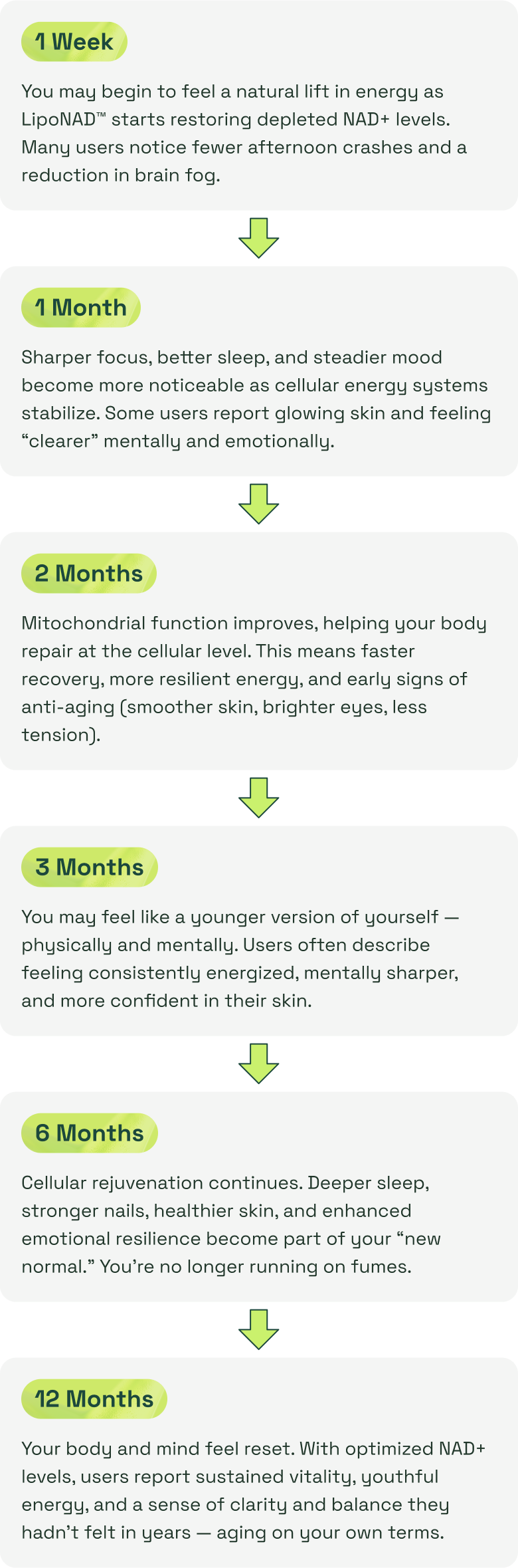 Increased energy, better focus, and improved mood are often the first changes reported. Deeper cellular benefits — like healthy aging support and improved metabolism — may take 4–6 weeks of consistent use.